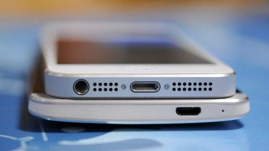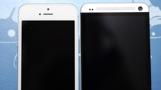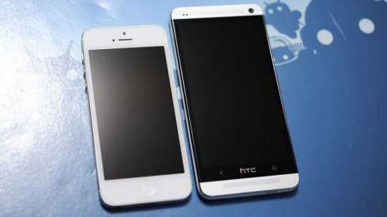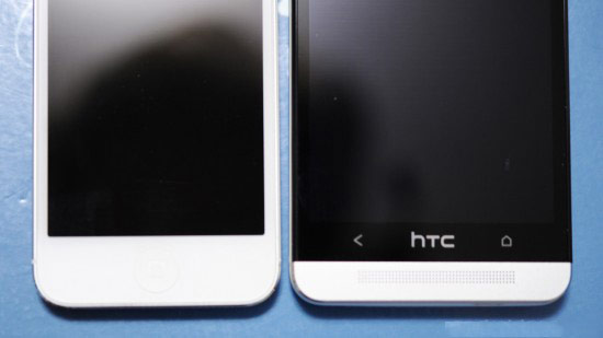 وقتی این دو ابزار را در دست میگیرید تفاوت آنچنانی میان آنها حس نمیکنید. اچتیسی وان حدودا 14 میلیمتر از آیفون 5 بلندتر است و پهنای آن نیز تقریبا یک سانتیمتر بیشتر است. وان تلفنی بزرگتر با یک نمایشگر 4.7 اینچ است، در حالی که آیفون 5 مجهز به نمایشگر 4 اینچ است.