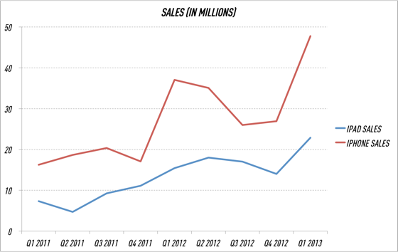 مهمترین نکته در گزارش تازه اپل مربوط به رشد فوقالعاده فروش آیفون است که از 37.04 میلیون دستگاه در سال گذشته و 26.9 میلیون دستگاه در سه ماهه پیش به 47.8 میلیون در سه ماهه اول 2013 رسیده است.